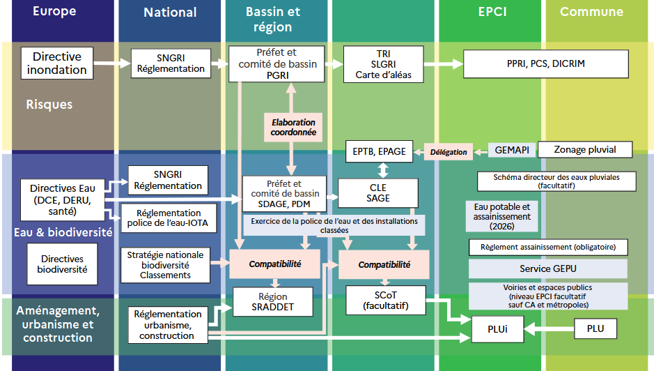 La gestion des eaux pluviales est encadrée par des lois et des outils réglementaires s'appliquant à des échelles différentes. Elle relève à la fois :